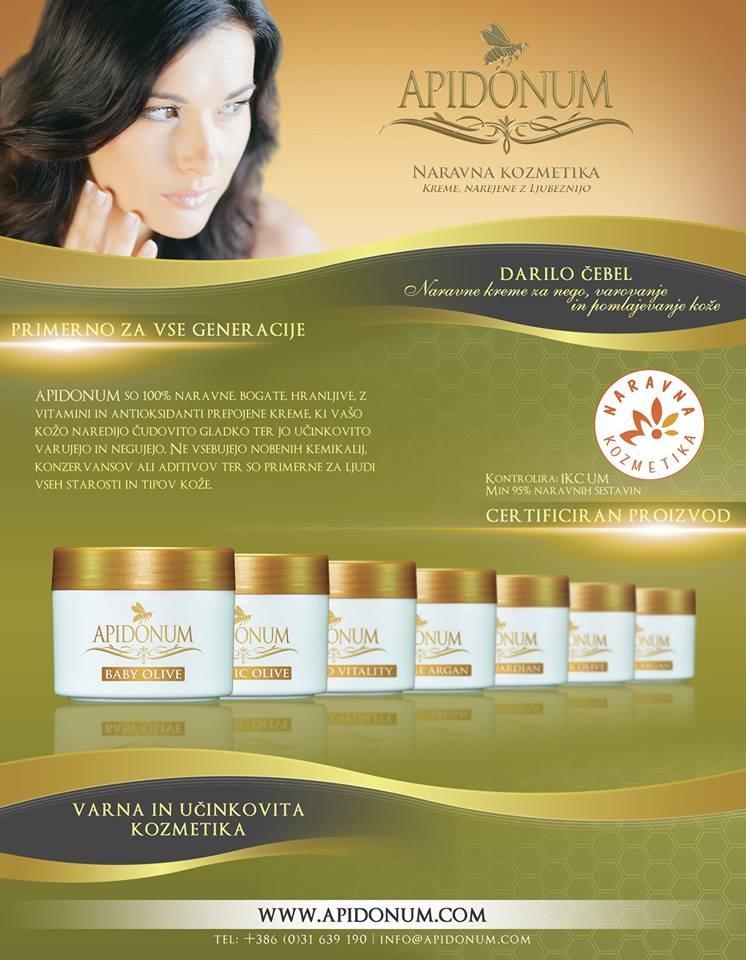 APIDONUM so 100% naravne, bogate, hranljive, z vitamini in antioksidanti prepojene kreme, ki vašo kožo naredijo čudovito gladko ter jo učinkovito varujejo in negujejo. Ne vsebujejo nobenih kemikalij, konzervansov ali aditivov ter so primerne za ljudi vseh starosti in tipov kože. Odlikuje jih prvovrstna kakovost sestavin, ki so popolnoma naravne in zdravstveno neoporečne, kar dokazujejo tudi številni prejeti certifikati. Patentirana formula izdelave omogoča najučinkovitejši izkoristek tega, kar nam je v svoji dolgoletni evoluciji ustvarila narava. Naraščajoči pozitivni odzivi naših uporabnikov so čvrst in realen dokaz, da vse več ljudi ceni kakovostno, naravno kozmetiko, ki ne vsebuje umetnih substanc in kemikalij ter ne povzroča nezaželenih učinkov. Ime "APIDONUM" je izpeljanka, ki izvira iz latinščine in predstavlja "Čebelje darilo". Dejansko se v kremah uporabljajo darovi, ki nam jih nudijo čebele in prav tako kot njihove domove zaznamuje šesterokotna oblika panjev, tudi nam podarjajo šest dragocenih proizvodov; med, cvetni prah, vosek, propolis, matični mleček ter čebelji strup. Ti darovi predstavljajo osnovo APIDONUM izdelkov, katerim so dodana raznovrstna bio olja in esence.