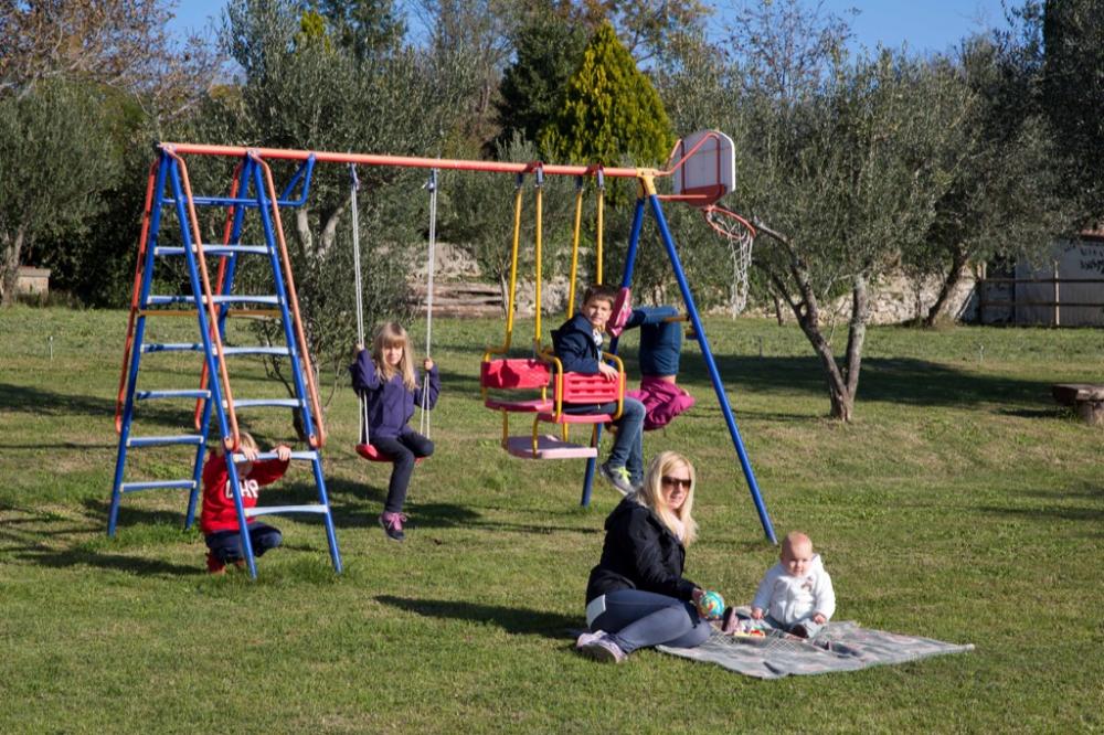 Na vrtu je skupen zidan žar za peko jedi, zunanja jedilnica, tlakovan vrt med oljkami in igrišče za otroke z gugalnico, plezalom in košarkarskimi koši. Obstaja celo izbor domačih živali, s katerimi se lahko spoprijateljite; kokoši, osli, poniji in zajci. Izven vrta je gostom na voljo tudi travnik, kjer se lahko v miru sprostijo na ležalniku, berejo knjigo ali igrajo igro z družinskimi člani.