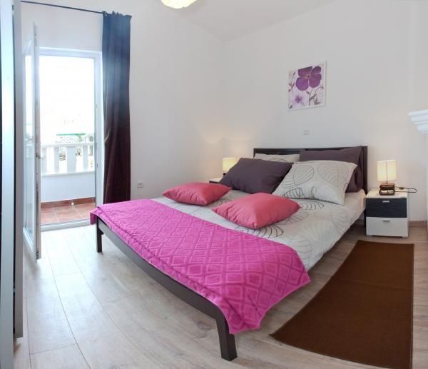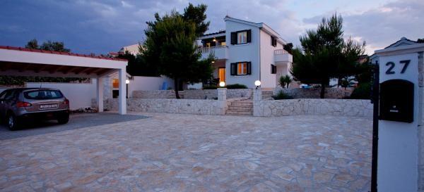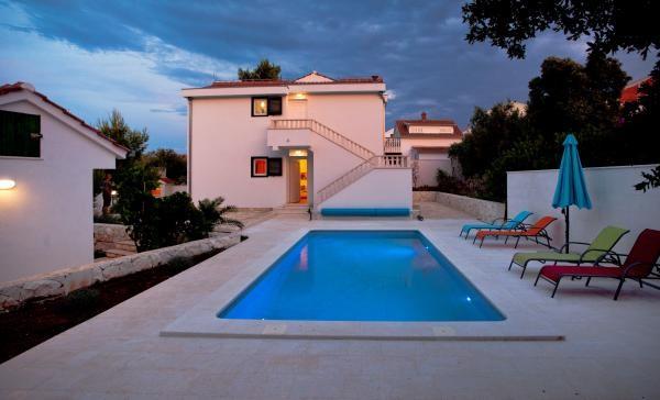 Mala vila sa 2 jednaka komforno uređena apartmana (2 +1) na prizemlju i katu povezani sa vanjskim stepenicama.U kući nije dozvoljeno pušenje.Kuća je prvi red do mora sa vanjskim bazenom dimenzija 7x3,35 m.Na parceli je i djelomično natkriven parking za 2 automobila.Veći dio parcele je popločana sa benkovačkim kamenom dok su preostali dio zelene površine sa autohtonim mediteranskim biljkama.Cijela parcela je ograđena sa betonskim zidom prosječne visine 1,4 m.U pomoćnoj kućici se nalazi bazenska strojarnica,wc i perilica rublja.Objekt posjeduje privatnu betonsku plažu.U cijenu najma uključene su i 4 ležaljke sa suncobranom,čišćenje i održavanje bazena . Sam objekt je smješten na poluotoku Mala Oštrica na isturenom dijelu obale sa nekolicinom malih nenastanjenih otočića u neposrednoj blizini a na udaljenosti od 1 km nalazi se arheološki spomenik Stari Trogir sa malom pješčanom plažom.